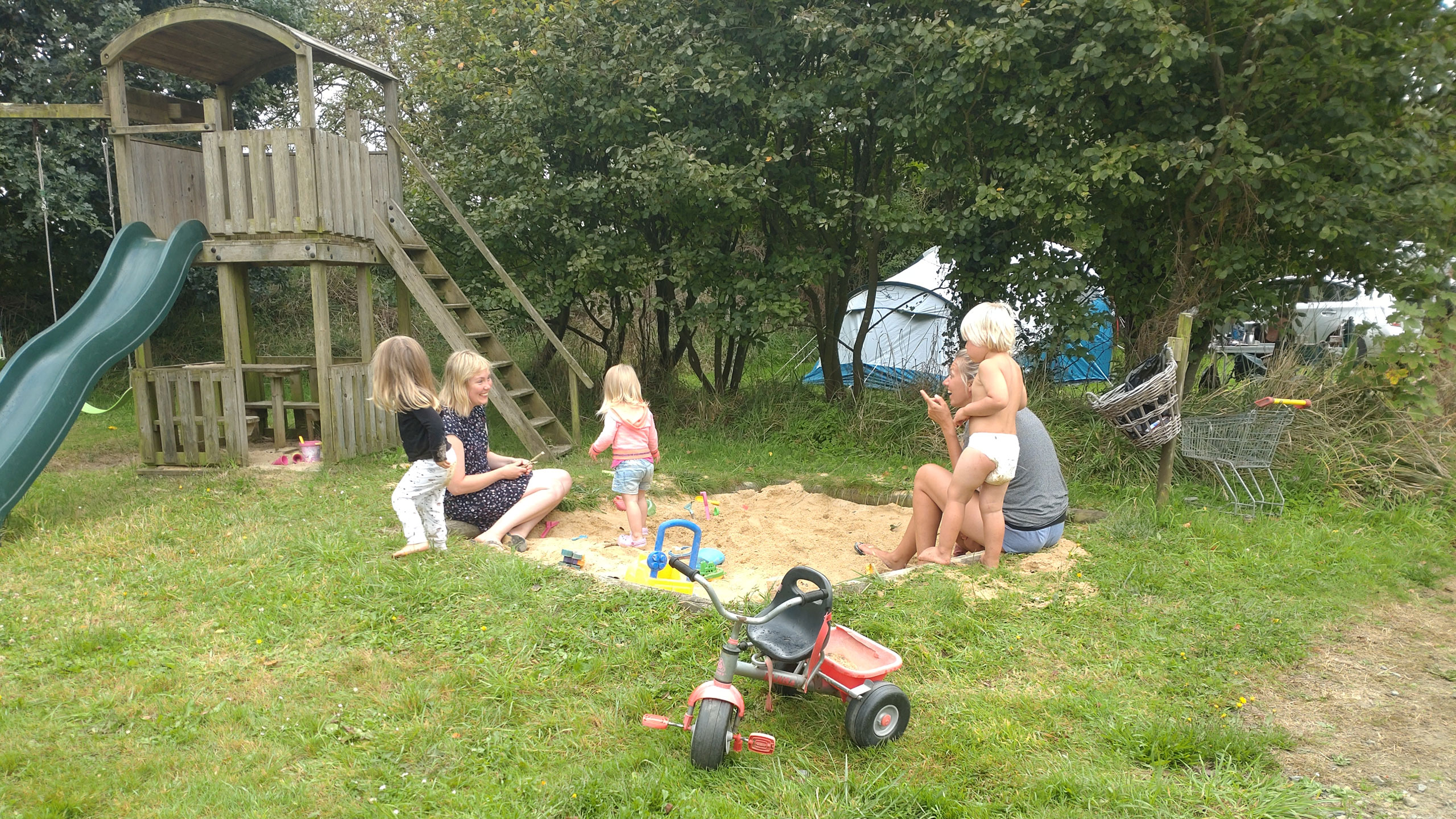 Onze speeltuin heeft natuurlijk een grote zandbak, toren met glijbaan en schommels.